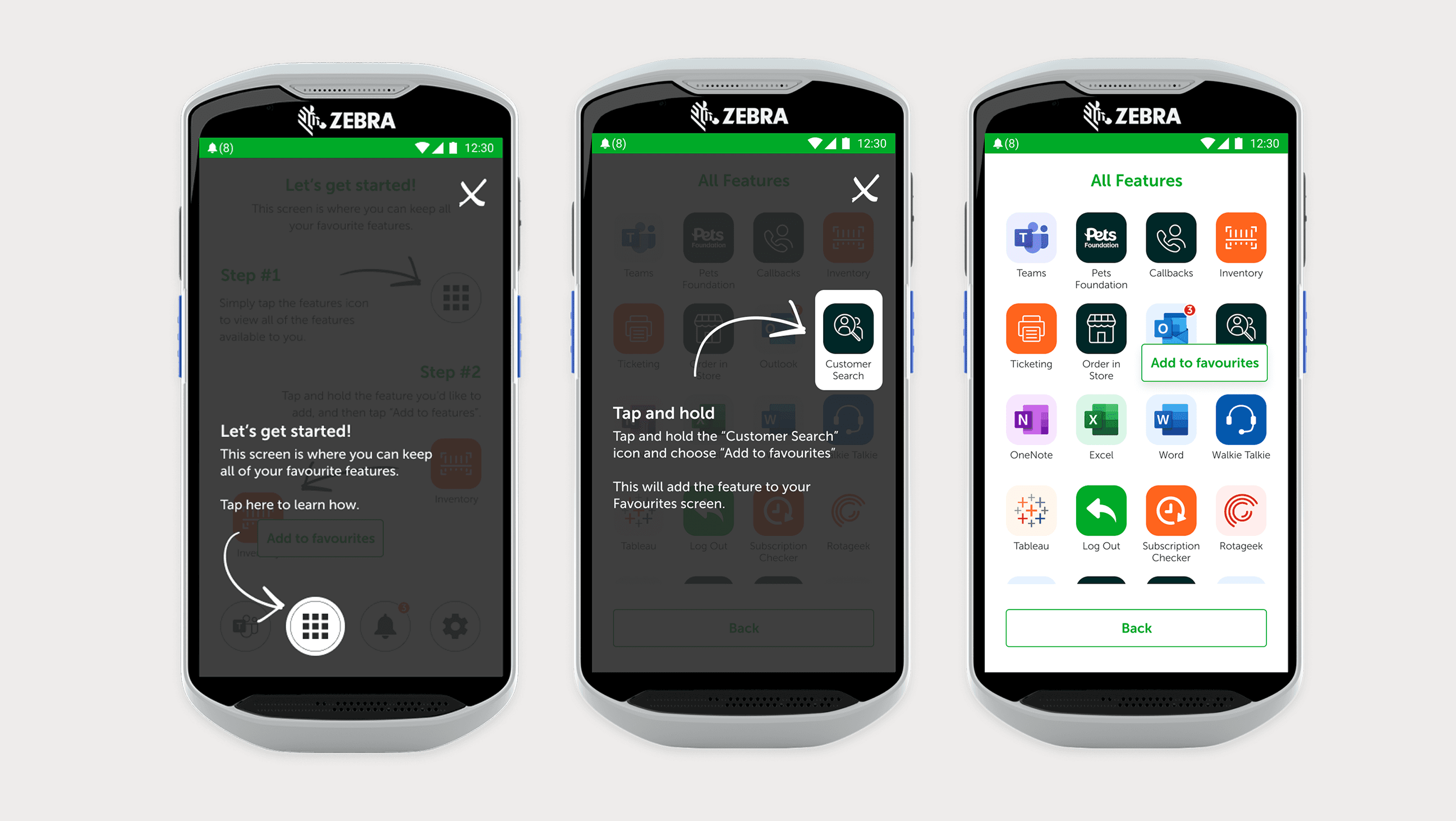 The favourites system came from wanting to follow established patterns. Colleagues already know how their personal Android phones work. Letting them customise their homescreen with the tools they use most meant less learning and faster access.